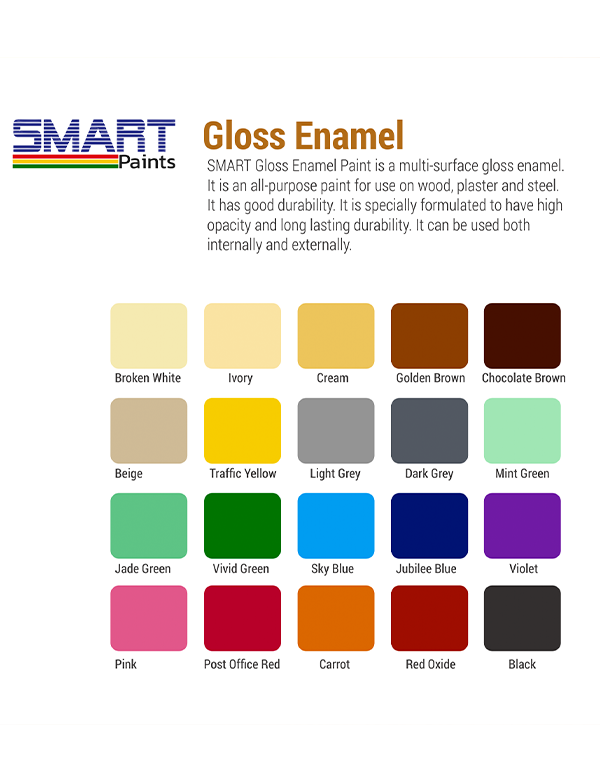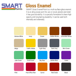 Interior & Exterior Smart Gloss Enamel Paint is a high gloss enamel specially designed for excellent durability in exterior & interior applications. It gives smooth & uniform finish with excellent leveling & hard mirror like gloss prevents from water & moisture. It can be use on wood, metal & variety of surfaces We are also offering fast drying industrial finishing enamel intended for coating on various metal products. It is ideal for industrial, OEM, maintenance and new construction applications